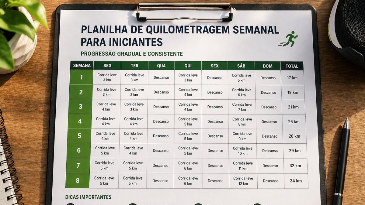 Na maioria dos casos, algo entre 6 e 15 km por semana já pode funcionar bem no início, dividido em 2 a 3 sessões. O mais importante é adaptar articulações, músculos e tendões antes de pensar em subir rápido.